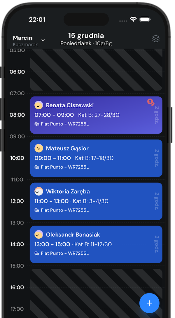 Niezależnie czy to pełny kurs prawa jazdy, czy jazdy doszkalające. Kursant zyskuje dostęp do swojego harmonogramu zajęć w aplikacji mobilnej, dzięki czemu zawsze wie, kiedy i gdzie ma kolejne zajęcia.